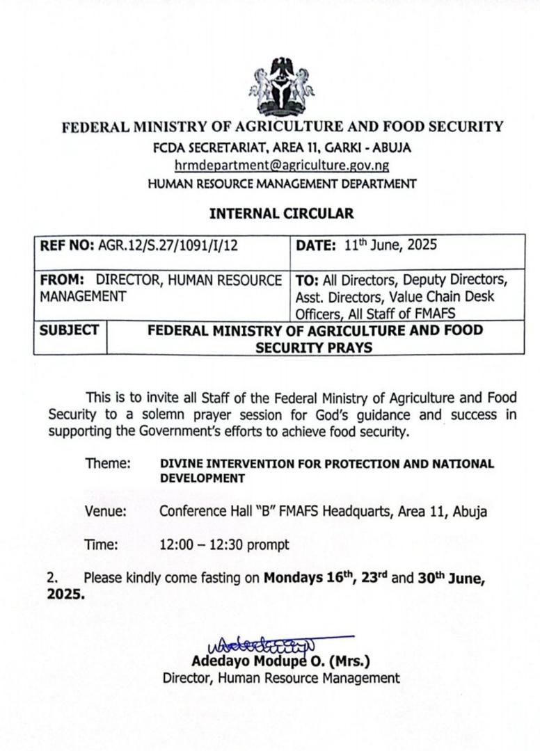 “This is to invite all staff of the Federal Ministry of Agriculture and Food Security to a solemn prayer session for God’s guidance and success in supporting the Government’s efforts to achieve food security,” the circular stated.