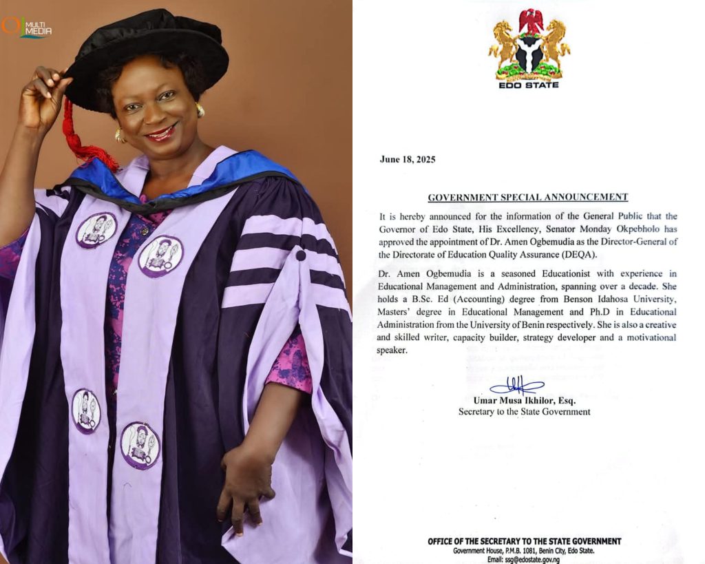 Edo State Governor, Senator Monday Okpebholo, has appointed Dr. Amen Ogbemudia as the Director-General of the Directorate of Education Quality Assurance (DEQA).