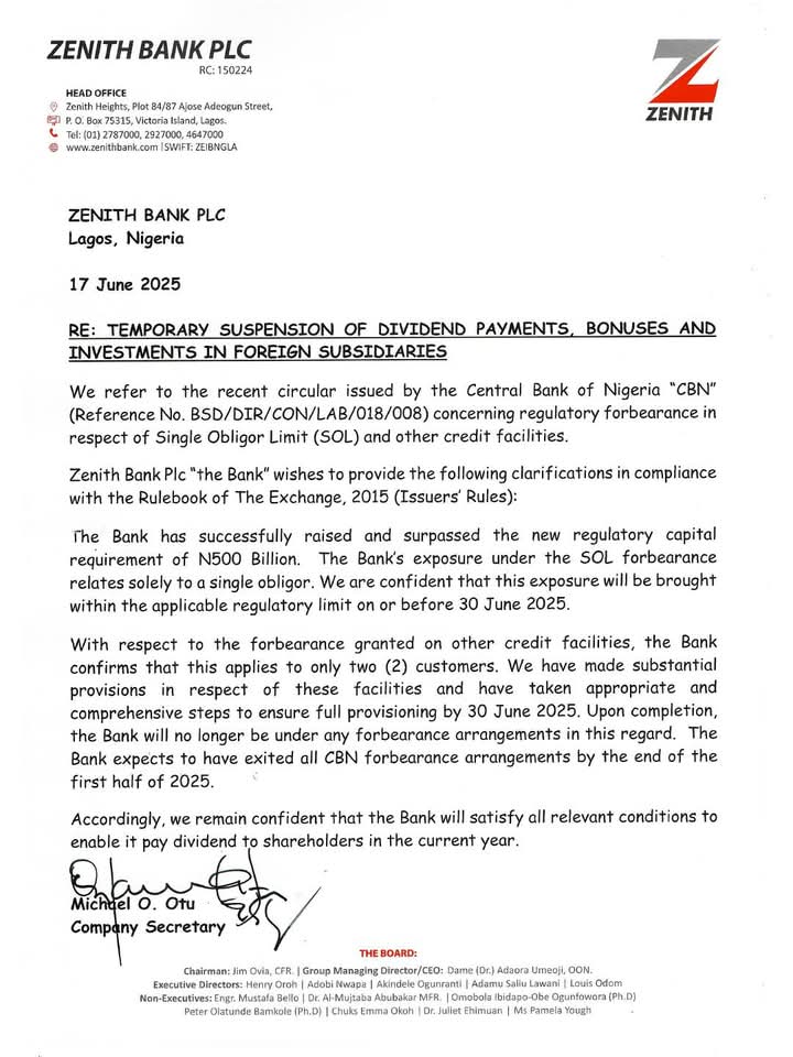The bank clarified that the SOL forbearance granted by the CBN pertains to a single obligor only. Zenith Bank expressed confidence that this exposure will be reduced to comply with regulatory limits before the deadline of June 30, 2025.